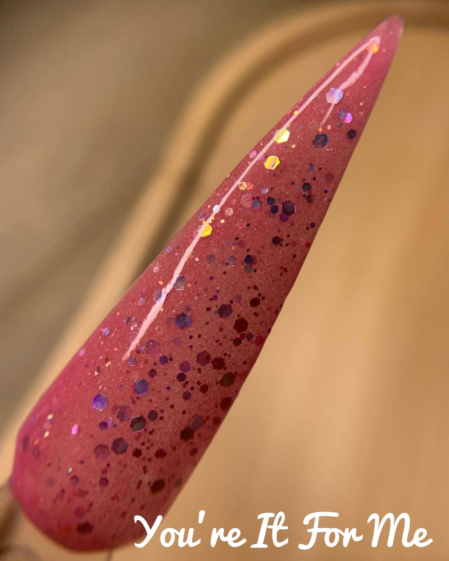 *Pink shimmer glow dip powder with chunky iridescent glitter*